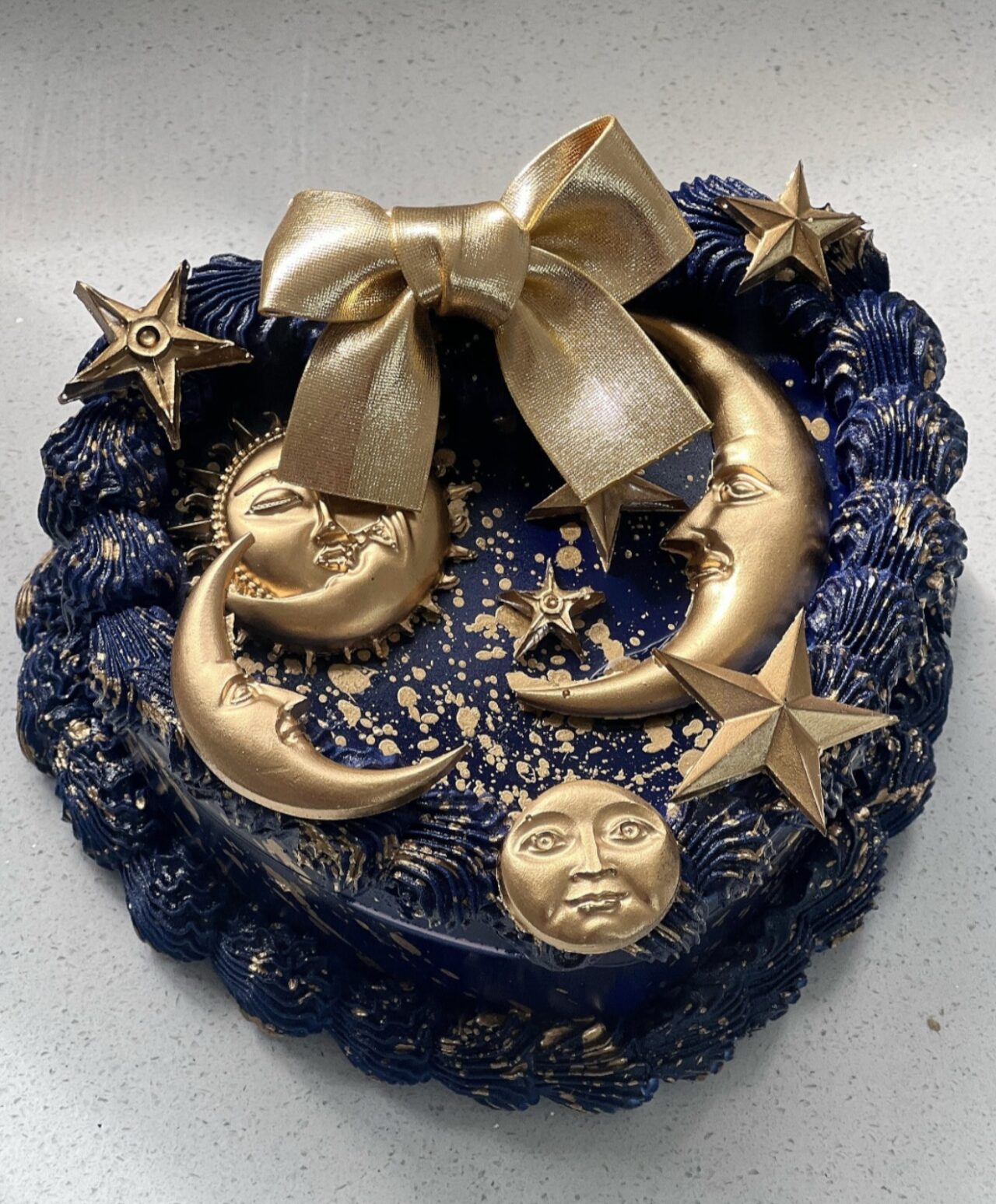 This cake is designed to reflect the nights sky featuring stars & moons on a midnight background.