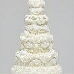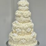 Inspired by the grace of classical ballet, the cake is adorned with delicate, hand-sculpted sugar swans nestled among ornate shell flourishes and intricate lace textures. Its monochromatic, all-white palette offers a striking, modern silhouette that commands the room without saying a word.